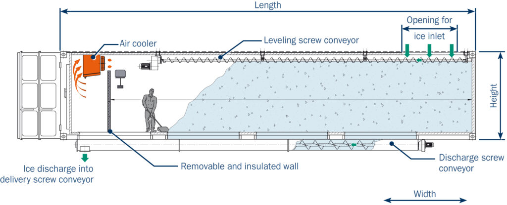 KTI semi-automatic ice storage systems (MIS-sa) are mostly used when smaller quantities of ice are to be stored or when the process does not need to be fully automated. Although the semi-automatic ice storage systems serve as intermediate storage just like all other ice storage systems, they only enable mechanically supported, manual ice discharge.